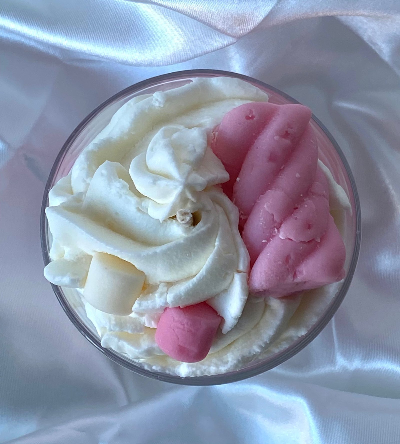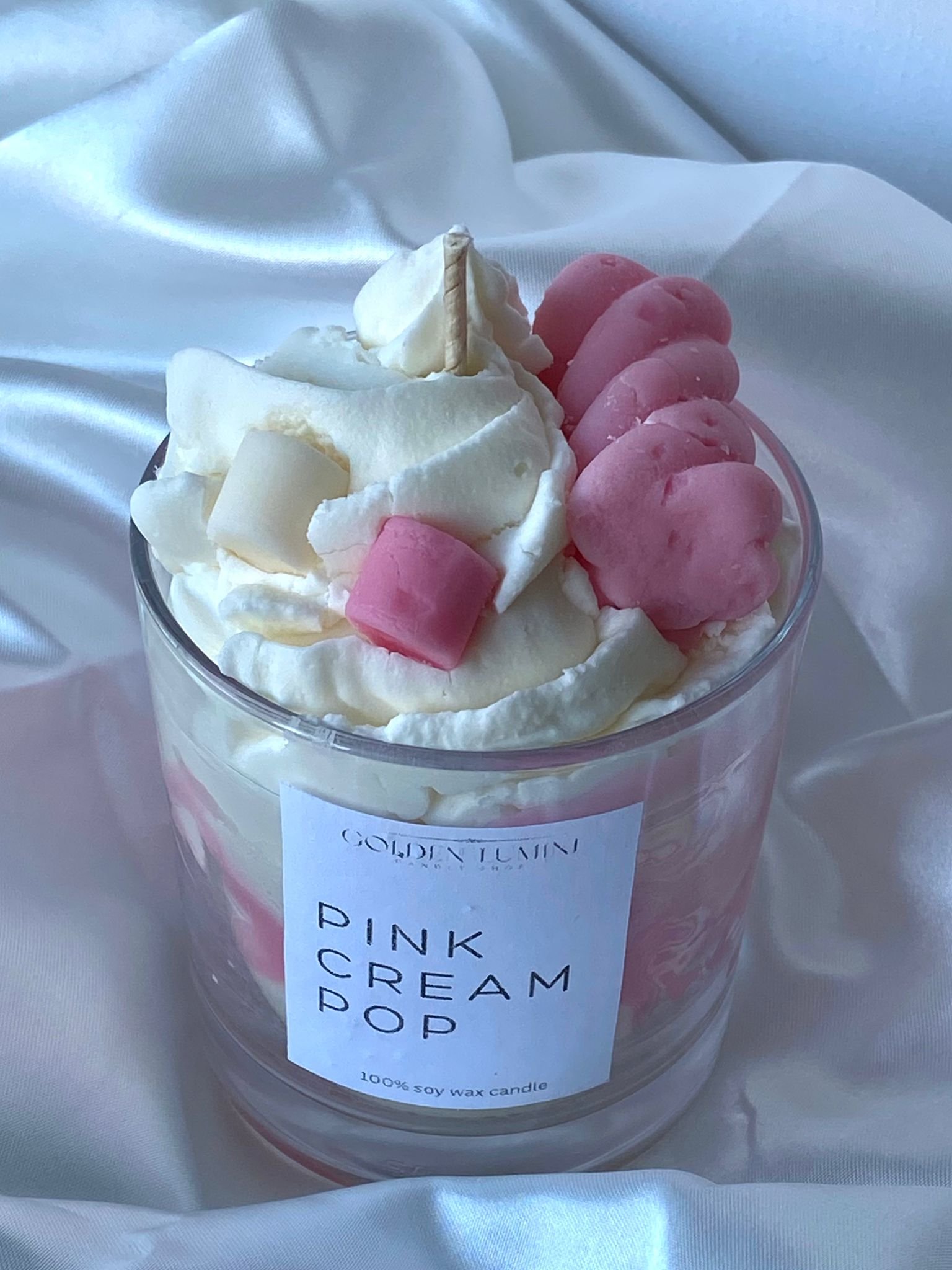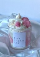 Lumânarea Pink Cream Pop este inspirată dintr-un desert cremos și delicat. Are un aspect alb combinat cu roz, cu frișcă din ceară, accente roz vizibile și decor cu o bezea mare și două mai mici. Designul este jucăuș și atrage imediat privirea.